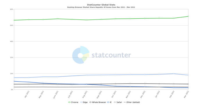 이런 이유들로 사용자들이 IE로부터 등을 돌리고, 공공기관과 일부 민간기업마저 ActiveX 플러그인 기반의 공인인증서를 폐기하는 등 사이트의 사용 환경 개선을 진행한 결과 굳이 IE를 사용해야 할 이유가 사라져 IE 점유율은 점차 떨어져 갔습니다.