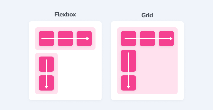 flexbox는 1차원 레이아웃이기 때문에 수직, 수평 중 한 방향으로만 아이템을 나열할 수 있지만, Grid는 2차원 레이아웃이라 수직, 수평 양방향 모두 자유롭게 아이템을 나열할 수 있습니다. 그렇기 때문에 복잡한 레이아웃의 경우 flexbox보다는 grid를 사용하는 것이 적절합니다.